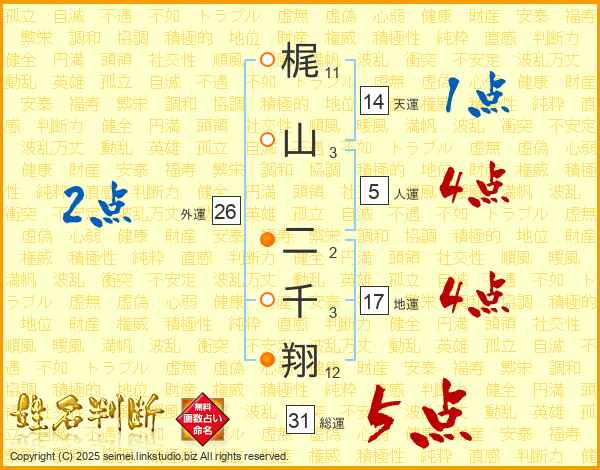 梶(11画)山(3画) 二(2画)千(3画)翔(12画)