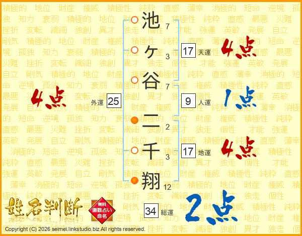 池(7画)ヶ(3画)谷(7画) 二(2画)千(3画)翔(12画)