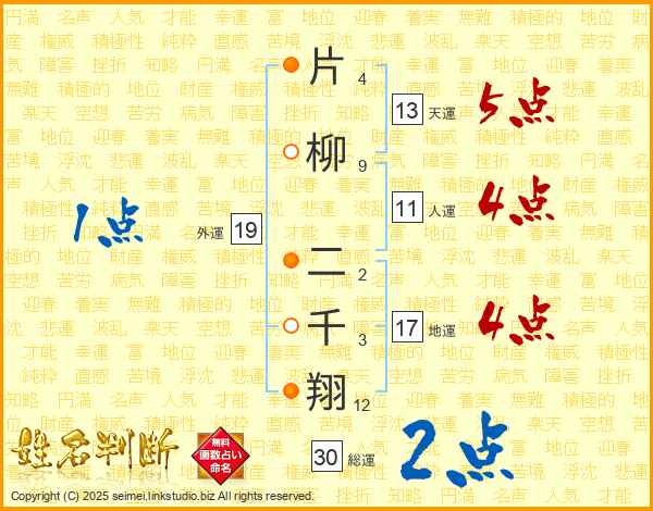 片柳二千翔さんの天運は13画の5点!