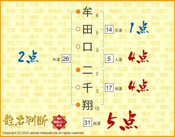 牟(6画)田(5画)口(3画) 二(2画)千(3画)翔(12画)