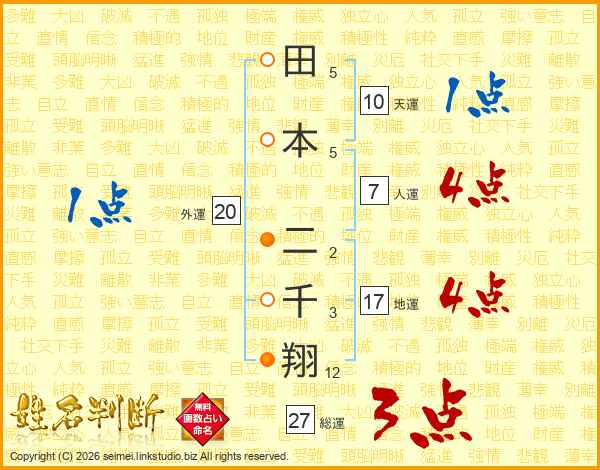 田(5画)本(5画) 二(2画)千(3画)翔(12画)