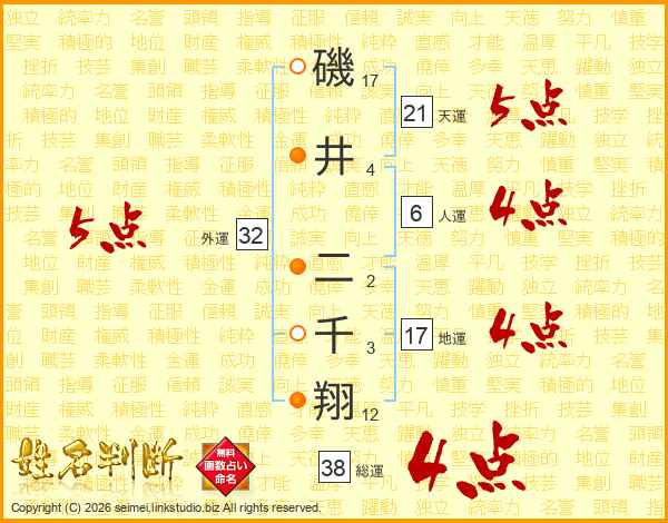 磯(17画)井(4画) 二(2画)千(3画)翔(12画)