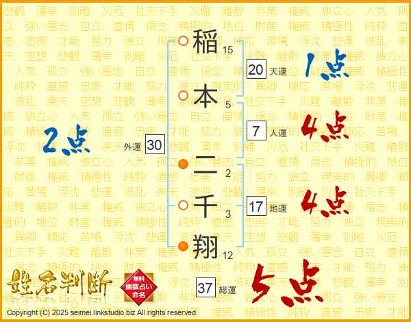稲(15画)本(5画) 二(2画)千(3画)翔(12画)