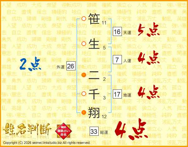 笹生二千翔さんの総運は33画の4点!