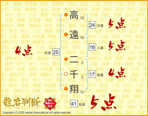 高(10画)遠(14画) 二(2画)千(3画)翔(12画)