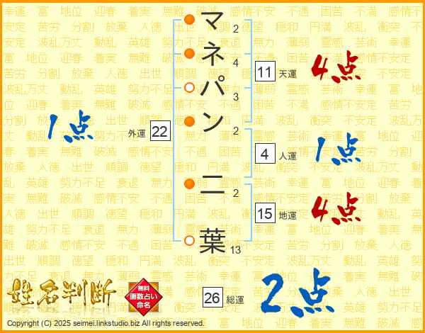 マ(2画)ネ(4画)パ(3画)ン(2画) 二(2画)葉(13画)