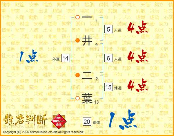 生活面を象徴する運勢です。外部から受ける影響力を表し、結婚運、家庭運や職場、環境への順応性を表します。総運から人運を引いた画数。姓や名が1文字の場合を除く。