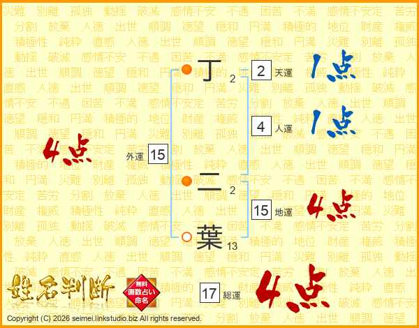 生活面を象徴する運勢です。外部から受ける影響力を表し、結婚運、家庭運や職場、環境への順応性を表します。総運から人運を引いた画数。姓や名が1文字の場合を除く。