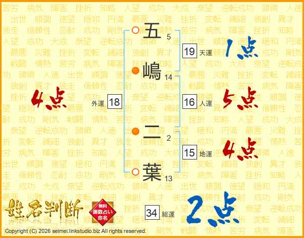 五(5画)嶋(14画) 二(2画)葉(13画)