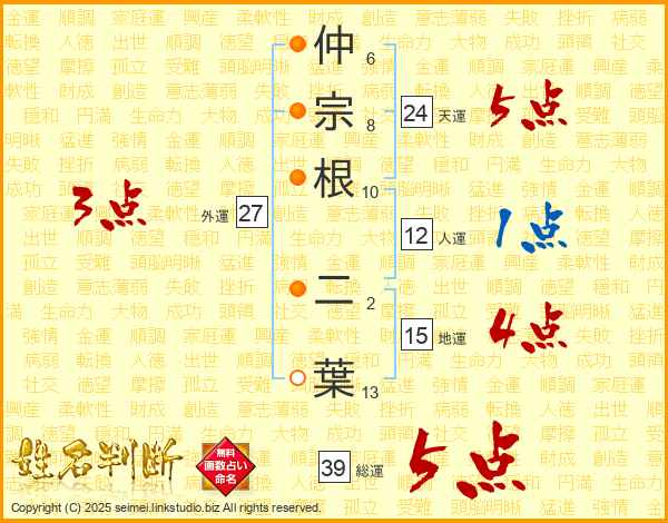 仲(6画)宗(8画)根(10画) 二(2画)葉(13画)
