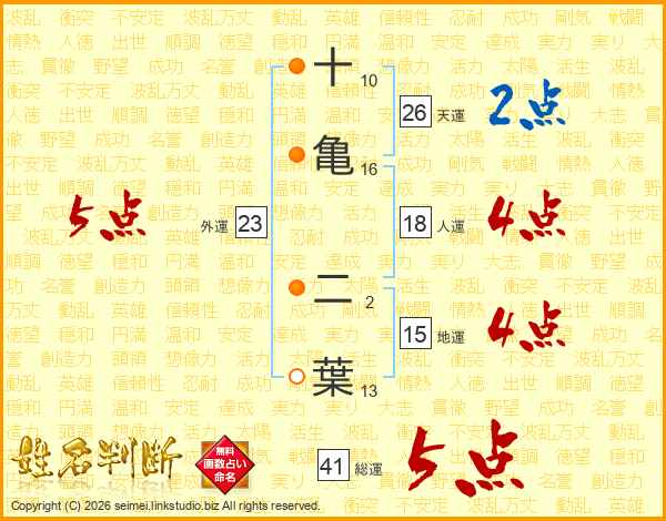 生活面を象徴する運勢です。外部から受ける影響力を表し、結婚運、家庭運や職場、環境への順応性を表します。総運から人運を引いた画数。姓や名が1文字の場合を除く。