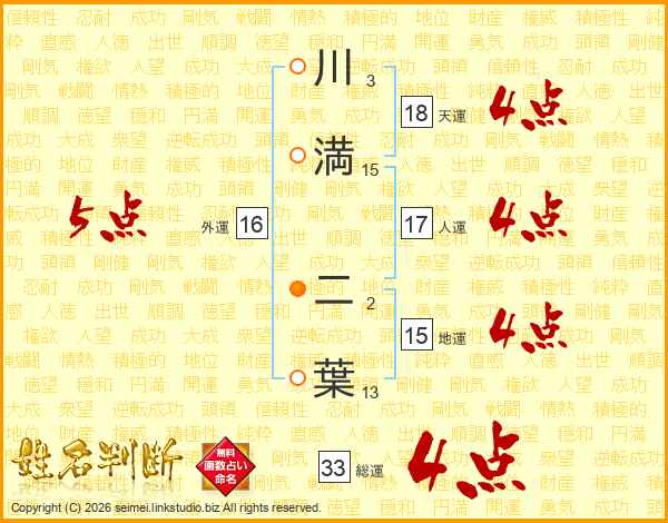 生活面を象徴する運勢です。外部から受ける影響力を表し、結婚運、家庭運や職場、環境への順応性を表します。総運から人運を引いた画数。姓や名が1文字の場合を除く。