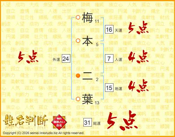 梅(11画)本(5画) 二(2画)葉(13画)