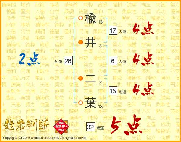 生活面を象徴する運勢です。外部から受ける影響力を表し、結婚運、家庭運や職場、環境への順応性を表します。総運から人運を引いた画数。姓や名が1文字の場合を除く。