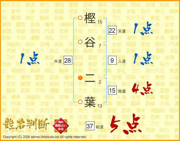 樫谷二葉さんの総運は37画の5点!