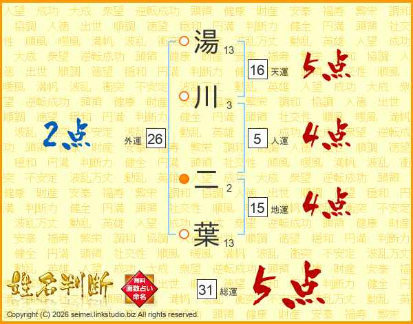 生活面を象徴する運勢です。外部から受ける影響力を表し、結婚運、家庭運や職場、環境への順応性を表します。総運から人運を引いた画数。姓や名が1文字の場合を除く。