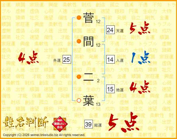 菅間二葉さんの総運は39画の5点!