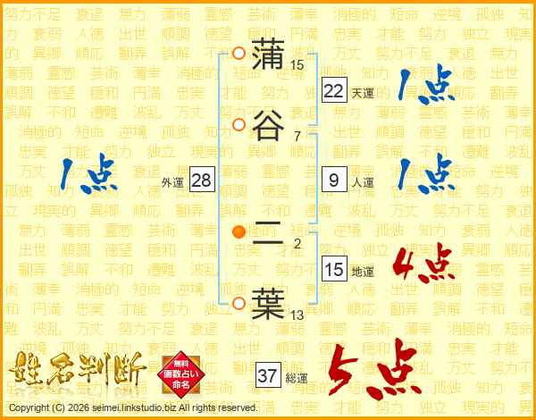 蒲谷二葉さんの総運は37画の5点!