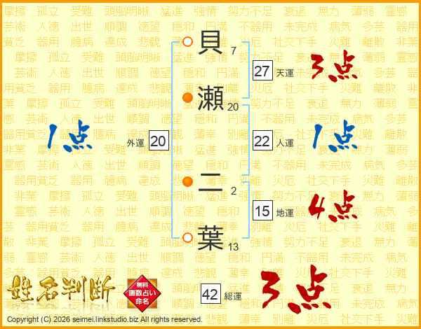 貝(7画)瀬(20画) 二(2画)葉(13画)