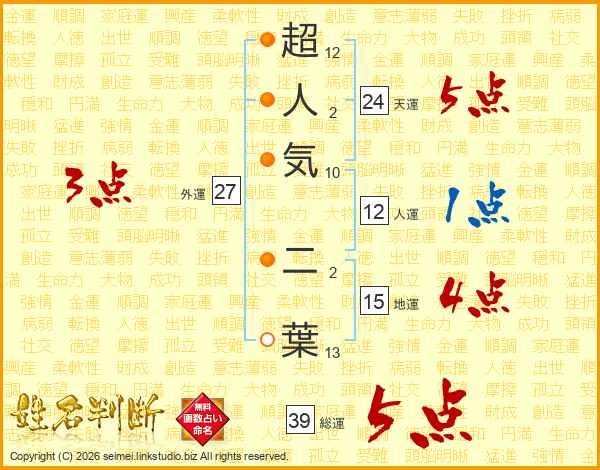 超人気二葉さんの総運は39画の5点!