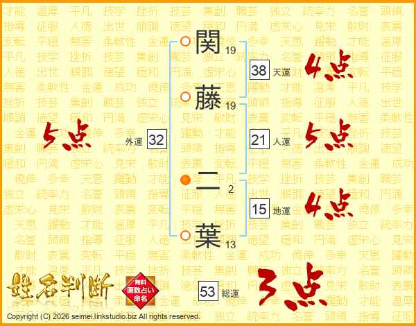 生活面を象徴する運勢です。外部から受ける影響力を表し、結婚運、家庭運や職場、環境への順応性を表します。総運から人運を引いた画数。姓や名が1文字の場合を除く。