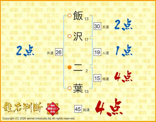 飯(13画)沢(17画) 二(2画)葉(13画)