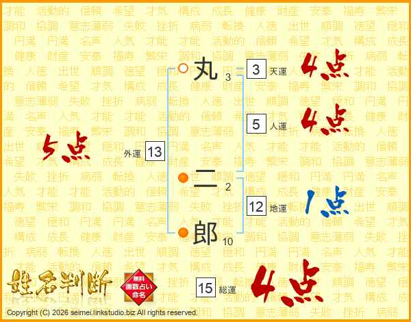 生活面を象徴する運勢です。外部から受ける影響力を表し、結婚運、家庭運や職場、環境への順応性を表します。総運から人運を引いた画数。姓や名が1文字の場合を除く。