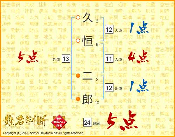 生活面を象徴する運勢です。外部から受ける影響力を表し、結婚運、家庭運や職場、環境への順応性を表します。総運から人運を引いた画数。姓や名が1文字の場合を除く。