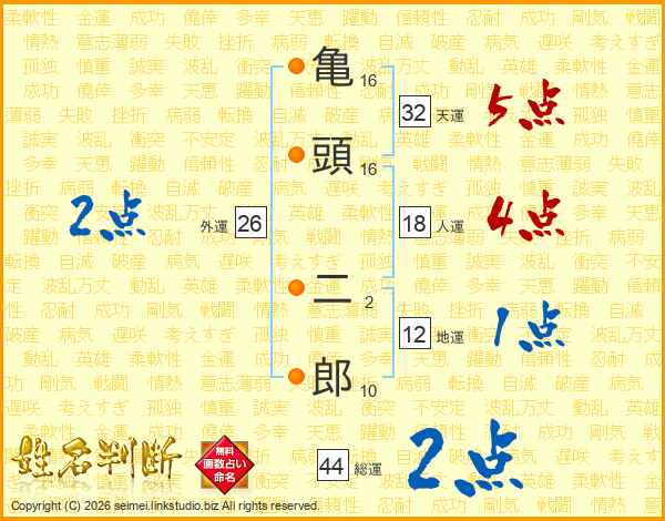 亀(16画)頭(16画) 二(2画)郎(10画)