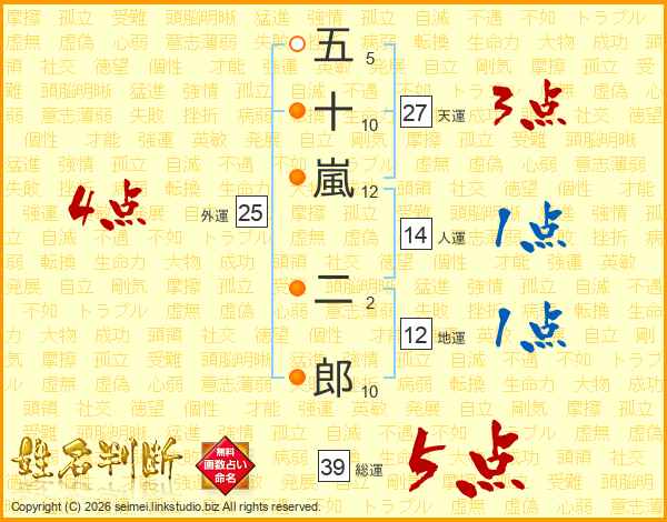 五(5画)十(10画)嵐(12画) 二(2画)郎(10画)