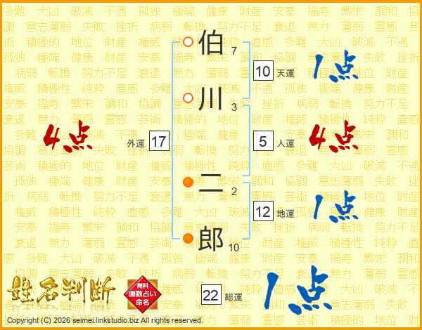 生活面を象徴する運勢です。外部から受ける影響力を表し、結婚運、家庭運や職場、環境への順応性を表します。総運から人運を引いた画数。姓や名が1文字の場合を除く。