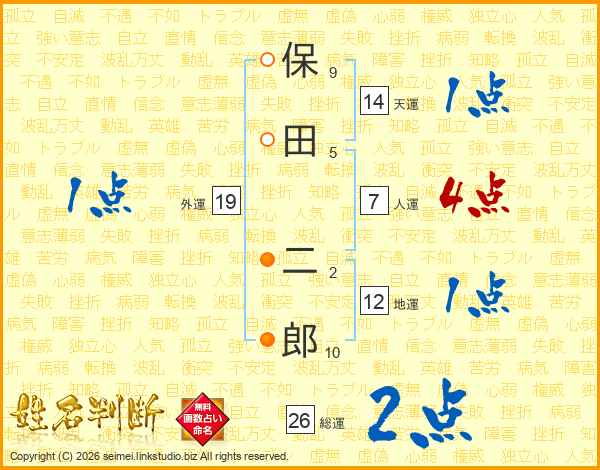 生活面を象徴する運勢です。外部から受ける影響力を表し、結婚運、家庭運や職場、環境への順応性を表します。総運から人運を引いた画数。姓や名が1文字の場合を除く。
