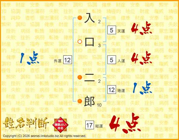 生活面を象徴する運勢です。外部から受ける影響力を表し、結婚運、家庭運や職場、環境への順応性を表します。総運から人運を引いた画数。姓や名が1文字の場合を除く。