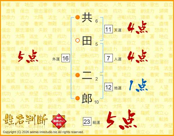 共田二郎さんの総運は23画の5点!
