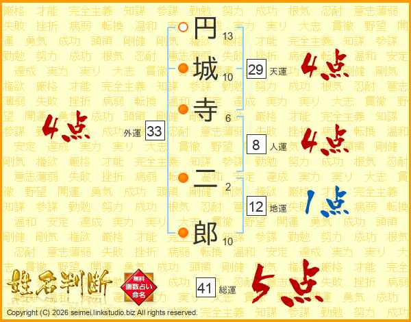 円(13画)城(10画)寺(6画) 二(2画)郎(10画)