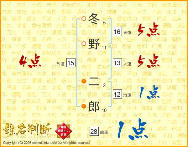 あなたの人生を表す1番重要な運勢です。生涯を通じて影響する総合運となり、主に50歳以降の晩年期に影響を及ぼします。苗字と名前の合計画数。