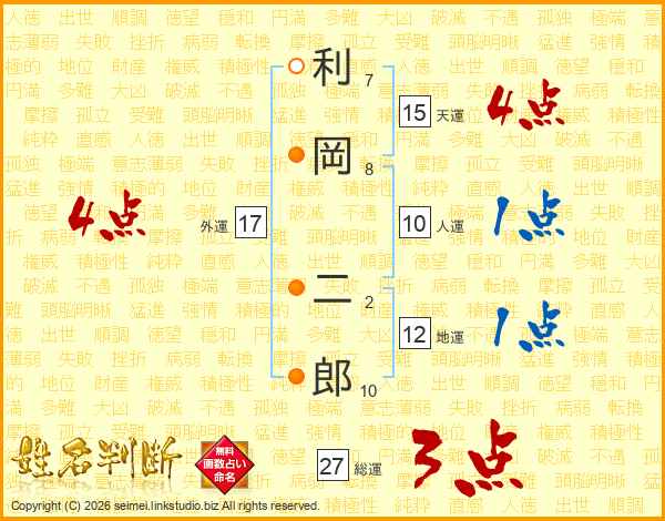 利岡二郎さんの総運は27画の3点!