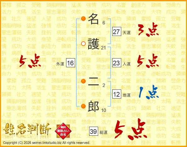 あなたの人生を表す1番重要な運勢です。生涯を通じて影響する総合運となり、主に50歳以降の晩年期に影響を及ぼします。苗字と名前の合計画数。