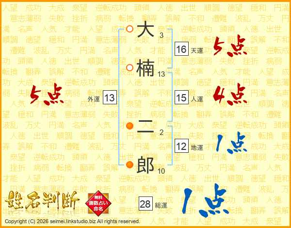 あなたの人生を表す1番重要な運勢です。生涯を通じて影響する総合運となり、主に50歳以降の晩年期に影響を及ぼします。苗字と名前の合計画数。