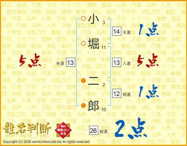 生活面を象徴する運勢です。外部から受ける影響力を表し、結婚運、家庭運や職場、環境への順応性を表します。総運から人運を引いた画数。姓や名が1文字の場合を除く。