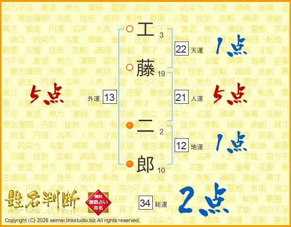 工藤二郎さんの人運は21画の5点!