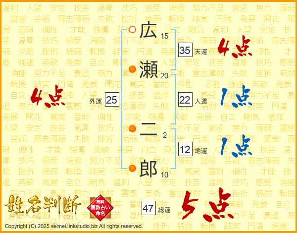 広(15画)瀬(20画) 二(2画)郎(10画)
