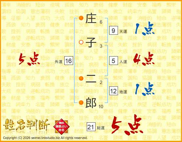 生活面を象徴する運勢です。外部から受ける影響力を表し、結婚運、家庭運や職場、環境への順応性を表します。総運から人運を引いた画数。姓や名が1文字の場合を除く。