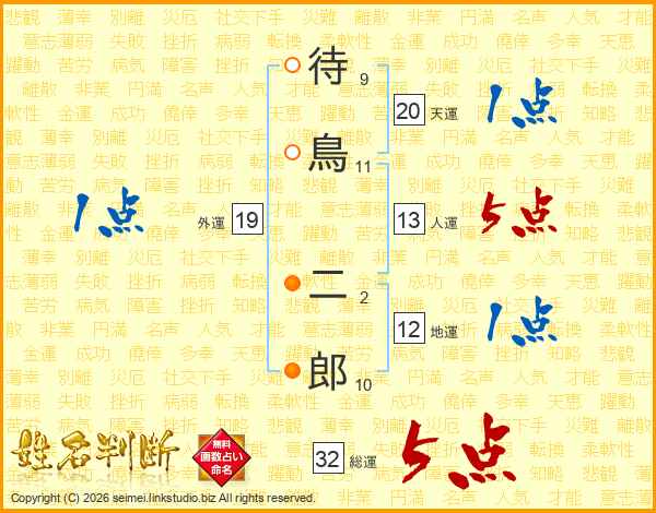待(9画)鳥(11画) 二(2画)郎(10画)