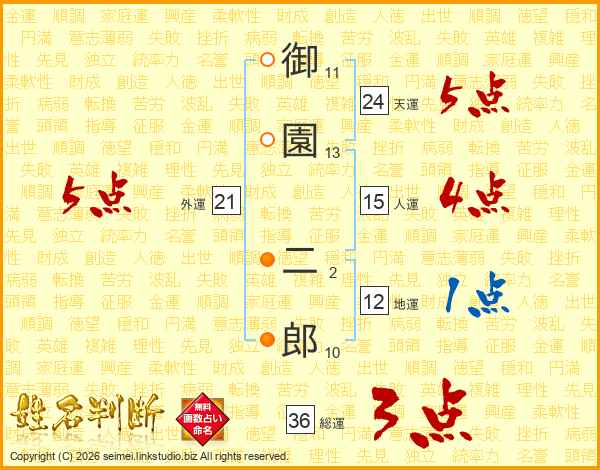 生活面を象徴する運勢です。外部から受ける影響力を表し、結婚運、家庭運や職場、環境への順応性を表します。総運から人運を引いた画数。姓や名が1文字の場合を除く。