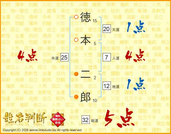 生活面を象徴する運勢です。外部から受ける影響力を表し、結婚運、家庭運や職場、環境への順応性を表します。総運から人運を引いた画数。姓や名が1文字の場合を除く。