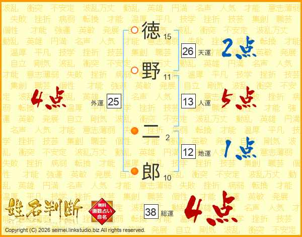 徳野二郎さんの総運は38画の4点!
