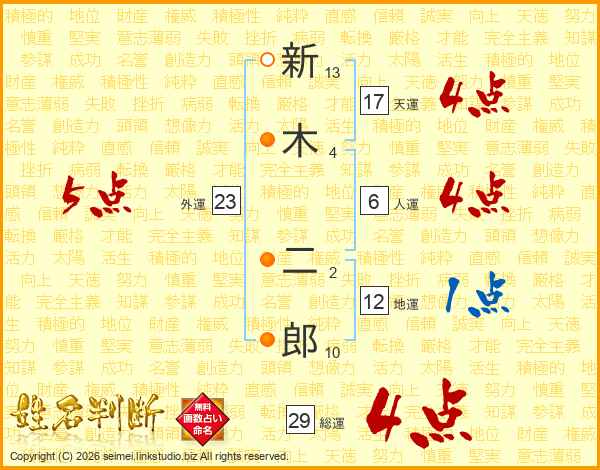 新木二郎さんの総運は29画の4点!