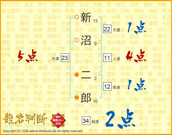 新沼二郎さんの総運は34画の2点!