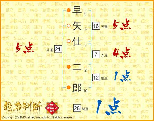 早(6画)矢(5画)仕(5画) 二(2画)郎(10画)